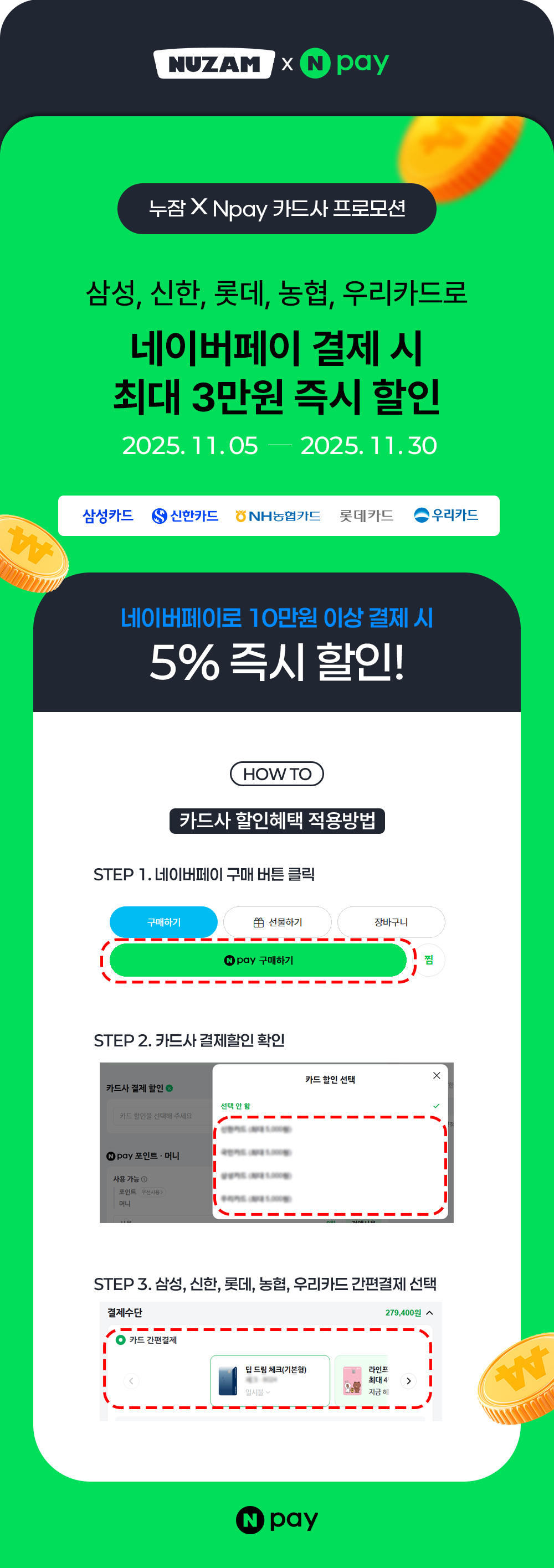 [이벤트] 11월 네이버페이 카드사 즉시 할인 프로모션 안내 (삼성, 신한, 롯데, 농협, 우리)